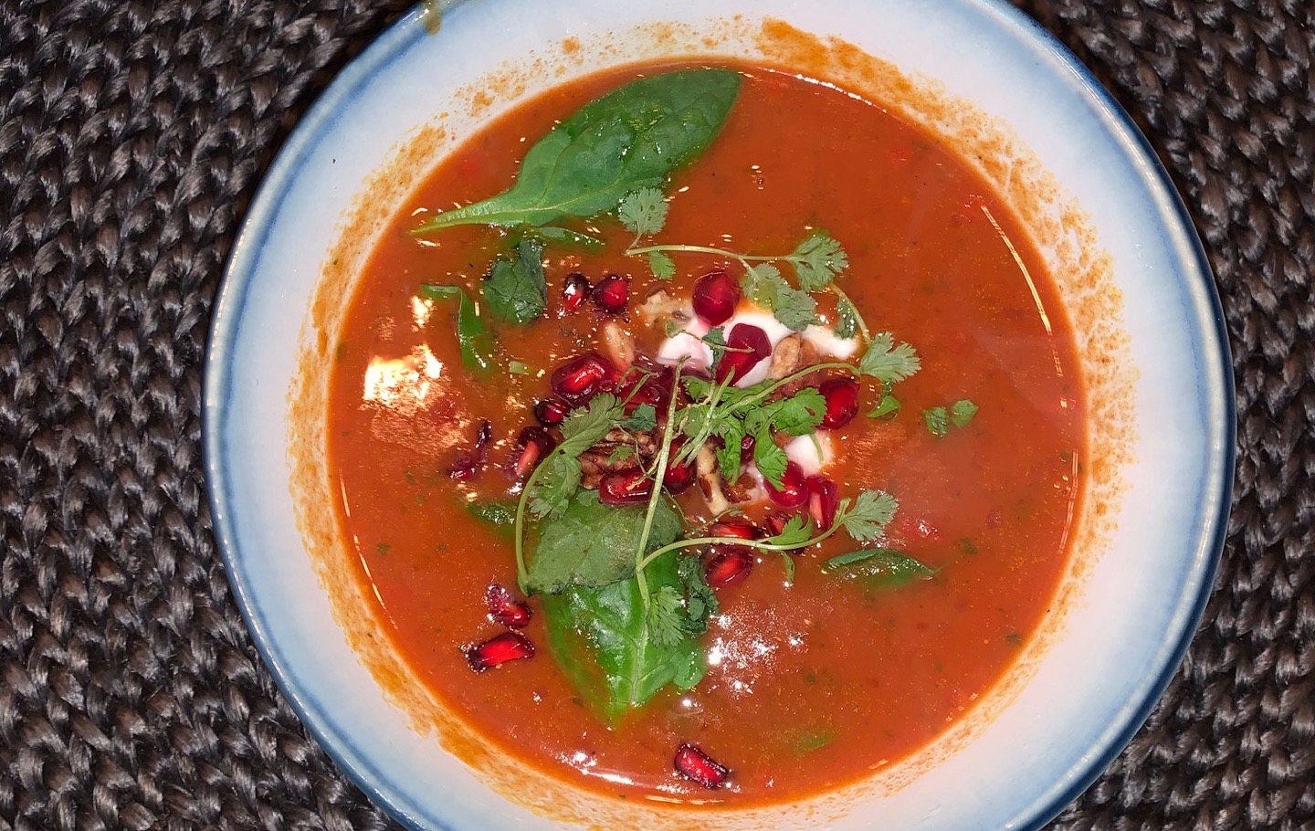 Tips: Topp tomatsuppen med en stor spiseskje plantebasert rømme, koriander, granateple og noen dråper fra saften av lime.